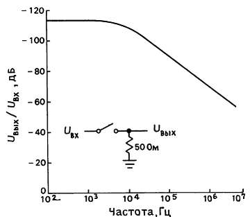 Обратите внимание на использование 50-омной нагрузки-сопротивления, обычного для радиосхем, но много меньше нормального для низкочастотных сигналов, где типичное значение полного сопротивления нагрузки составляет 10 кОм и более. Даже при нагрузке 50 Ом сквозное прохождение сигнала на высоких частотах становится значительным (на частоте 30 МГц емкость 1 пФ имеет полное сопротивление 5 кОм, что вызывает сквозное прохождение — 40 дБ). И разумеется, имеется значительное ослабление (и нелинейность в передаче) сигнала при работе на 50-омную нагрузку, поскольку типичное значение Rвкл составляет 30 Ом (75 Ом в худшем случае). При нагрузке 10 кОм ситуация со сквозной передачей сигнала, конечно же, намного хуже.