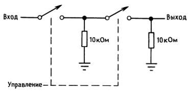 Для любого ПТ-ключа сопротивление нагрузки должно быть в диапазоне от 1 до 100 кОм, чтобы предотвратить емкостное прохождение входного сигнала в состоянии «ВЫКЛ», которое имело бы место при большем сопротивлении. Сопротивление нагрузки выбирается компромиссным. Малое сопротивление уменьшит емкостную утечку, но вызовет ослабление входного сигнала из-за делителя напряжения, образованного сопротивлением проводящего ПТ Rвкл и сопротивлением нагрузки. Так как Rвкл меняется с изменением входного сигнала (при изменении UЗИ), это ослабление приведет к некоторой нежелательной нелинейности. Слишком низкое сопротивление нагрузки проявляется также и на входе ключа, нагружая источник входного сигнала. В разд. 3.12 и 4.30 предложены некоторые решения этой проблемы (многоступенчатые ключи, компенсация сопротивления Rвкл). Привлекательная альтернатива — применение еще одного ПТ-ключа, закорачивающего выход на землю, если последовательно включенный ПТ находится в состоянии «ВЫКЛ»; таким образом формируется однополюсный ключ на два направления (подробнее об этом см. в следующем разделе).