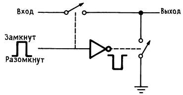 Переключение управляющего сигнала на уровень земли запирает оба ПТ, размыкая таким образом цепь. В результате получается аналоговый переключатель для сигналов в диапазоне от земли до UСС. Это основа схемы КМОП «передающего вентиля» 4066. Как и описанные ранее ключи, схема работает в двух направлениях — любой ее зажим может служить входным.