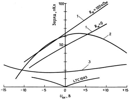 Во всех трех случаях сигнал на затворе меняется в полном диапазоне, т. е. на 30 В или в пределах обозначенных на графике уровней напряжения питания для МОП-транзисторов и от — 15 В до уровня сигнала для ключей на n-канальных ПТ с p-n-переходом. Для последних существует сильная зависимость величины динамической помехи от сигнала, поскольку диапазон изменения напряжения затвора пропорционален разности между уровнем сигнала и уровнем —15 В. Хорошо сбалансированные КМОП-ключи имеют относительно малую динамическую помеху, поскольку попадающие в канал заряды у комплементарных МОП-транзисторов стремятся скомпенсировать друг друга (когда на одном затворе напряжение растет, на другом - падает). Чтобы дать представление о масштабе этих эффектов, скажем, что заряд 30 пКл соответствует разности потенциалов (сказку) в 3 мВ на конденсаторе емкостью 0,01 мкФ. Это значительная емкость для конденсатора фильтра, и видно, что это действительно проблема, так как динамическая помеха в 3 мВ является существенной погрешностью при работе с аналоговыми сигналами низкого уровня.