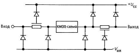 Рис. 3.50. Цепи защиты входа (выхода) КМОП-схем. Последовательно включенный резистор на выходе часто не ставится.