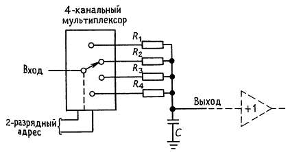 В схеме использован мультиплексор для выбора одного из четырех предварительно подобранных резисторов путем набора 2-разрядного двоичного (цифрового) адреса. Мы решили поставить переключатель на входе, а не после резисторов, так как при этом уменьшается «впрыск» заряда в точку с более низким сопротивлением источника сигнала. Еще одна возможность, конечно же, состоит в том, чтобы использовать ПТ-ключи для выбора конденсатора фильтра. Чтобы получить очень широкий диапазон постоянных времени, можно было бы попробовать это сделать, но при этом конечное значение Rвкл ключа ограничит коэффициент передачи фильтра на высоких частотах максимум Rвкл/Rпосл. На схеме обозначен также буфер с единичным усилением, стоящий вслед за фильтром, поскольку выходное сопротивление схемы велико. В следующей главе вы увидите, как построить «совершенный» повторитель (с точно заданным коэффициентом усиления, высоким Zвх, низким Zвых, отсутствием сдвига UБЭ и т. п.). Разумеется, в том случае когда стоящий вслед за фильтром усилитель имеет высокое входное сопротивление, повторитель не нужен.