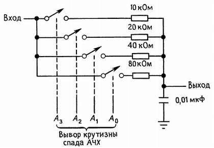 При таком масштабном соотношении сопротивлений резисторов, которое приведено здесь, можно задавать 16 равноотстоящих значений частоты среза путем замыкания этих ключей в различных комбинациях.