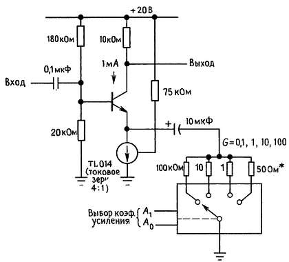 В качестве эмиттерной нагрузки мы использовали источник (точнее, приемник) неизменного тока, как это было сделано в более раннем примере, чтобы можно было получить коэффициент усиления много меньше единицы. Далее, мы применили мультиплексор для выбора одного из четырех резисторов. Обратите внимание на разделительный конденсатор, который нужен, чтобы сделать ток покоя не зависящим от коэффициента усиления.