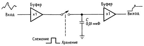Схема слежения-хранения. Рис. 3.54 демонстрирует, как можно сделать схему «слежения-хранения», которая будет кстати, когда мы захотим преобразовать аналоговый сигнал в поток цифровых комбинаций («аналого-цифровое преобразование»). При этом схема будет сохранять неизменным каждый уровень аналогового сигнала, пока вычисляется его величина. Данная схема проста. Входной буферный усилитель с единичным усилением выдает на низкоомный выход копию входного сигнала, направляя ее на конденсатор малой емкости. Чтобы сохранить (запомнить) уровень аналогового сигнала в любой заданный момент, вы просто размыкаете ключ. Высокое полное входное сопротивление второго буфера (у которого на входе должны быть полевые транзисторы, чтобы входной ток не слишком отличался от нуля) предотвращает нагрузку конденсатора, так что напряжение на нем «хранится» до тех пор, пока ПТ-ключ не замкнется снова.