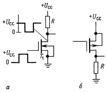 Рис. 3.56. Логические инверторы на n-канальном (а) и p-канальном (б) МОП-транзисторах.
