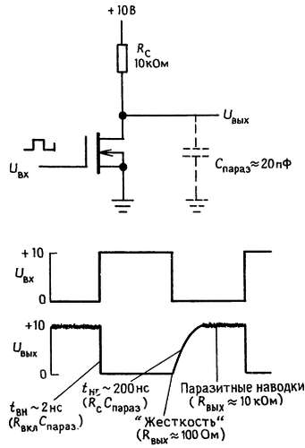 Емкость затвор-канал. Емкость между управляющим затвором и каналом вызывает еще один эффект, а именно наводку неприятных (даже когда они малы) переходных помех на цепь сигнала при замыкании или размыкании ключа. Сей предмет заслуживает серьезного обсуждения, так что мы отложим его до следующего раздела.