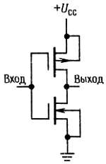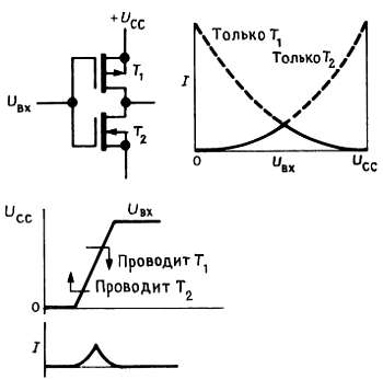 Потенциал земли на входе вводит нижний транзистор в состояние отсечки, а верхний — во включенное (замкнутое) состояние, в результате чего на выходе будет высокий логический уровень. Высокий (+UСС) уровень входа действует противоположным образом, давая на выходе потенциал земли. Это инвертор с низким выходным сопротивлением в обоих состояниях и в нем совершенно отсутствует ток покоя. Называют его КМОП-инвертор (инвертор на комплементарных МОП-транзисторах), и он является базовой структурой для всех цифровых логических КМОП-схем — семейства, которое уже стало преобладающим в больших интегральных схемах (БИС) и которому, похоже, предопределено заменить более ранние семейства логических схем (так называемые ТТЛ-схемы), построенные на биполярных транзисторах. Обратите внимание на то, что КМОП-инвертор представляет собой два комплементарных МОП-ключа, соединенных последовательно и включаемых попеременно, в то время как аналоговый КМОП-ключ (рассмотренный ранее в этой главе) — это параллельно соединенные комплементарные МОП-ключи, включаемые и выключаемые одновременно.