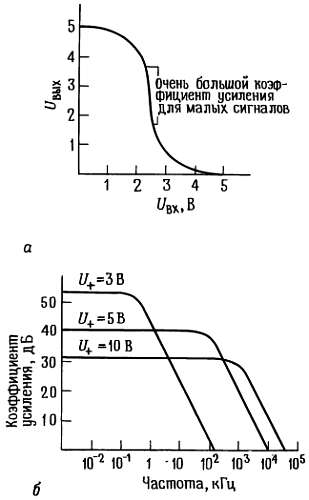 Вариации Rн и gm с изменением тока стока таковы, что наибольший коэффициент усиления наблюдается при относительно малых значениях тока стока, т. е. при низком напряжении питания (порядка 5 В). Эта схема не является хорошим усилителем; у нее есть недостатки — это очень высокое выходное сопротивление (особенно при работе с низким напряжением питания), плохая линейность и непредсказуемая величина коэффициента усиления. Однако она проста и недорога (КМОП-инверторы по 6 в одном корпусе продаются по цене менее полдоллара за корпус), и ее иногда используют для усиления малых сигналов, форма которых несущественна. Примеры применения таких схем - сигнализатор близости электросети (который усиливает емкостные наводки переменного тока сетевой частоты), генераторы с кварцевыми резонаторами и устройства с частотной модуляцией и частотной манипуляцией (см. гл. 15).