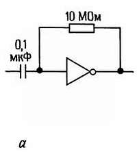 Линейный усилитель на КМОП-транзисторах. КМОП-инверторы, как впрочем и все цифровые логические схемы, предназначены для работы с цифровыми логическими уровнями сигналов. Поэтому, за исключением времени переходных процессов, входы и выходы подключены к земле или к шине UСС (обычно +5 В). И опять-таки за исключением времени, которое длятся эти переходные процессы (типичная величина - несколько наносекунд), здесь нет тока стока в состоянии покоя. Оказывается, КМОП-инвертор обладает некоторыми интересными свойствами, когда он работает с аналоговыми сигналами. Взгляните снова на рис. 3.61.