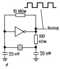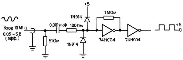 Это приведет нас в точку Uвых = Uвх на графике рис. 3.62, а. Как мы позже увидим, такое включение, как на рис. 3.63, а, снижает входное полное сопротивление за счет «шунтирующей обратной связи». Поэтому если важно иметь высокое входное полное сопротивление на высоких частотах, то предпочтение следует отдать схеме рис. 3.63, б. Третья схема (рис. 3.63, в) — это использующий КМОП-усилитель классический генератор с кварцевой стабилизацией, описанный в разд. 5.13. На рис. 3.64 дан вариант схемы рис. 3.63, а, который используется для генерации сигналов строго прямоугольной формы частотой 10 МГц (тактовый генератор для цифровых логических схем) из синусоидального входного сигнала. Эта схема работает хорошо при амплитуде сигнала на входе от 50 мВ до 5 В (эффективные значения).