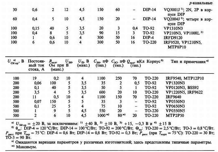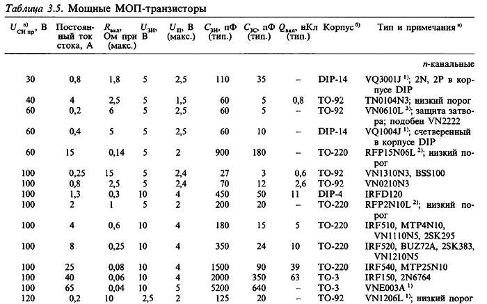 Небольшие мощные МОП-транзисторы стоят существенно меньше доллара, и выпускаются они во всех обычных транзисторных корпусах, а также по несколько транзисторов в удобном корпусе DIP, в котором выпускаются и большинство ИМС. Ирония судьбы заключается в том, что теперь уже трудно найти дискретные маломощные МОП-транзисторы, зато нет проблем с мощными МОП-транзисторами. В табл. 3.5 перечислены наиболее представительные типы мощных МОП-транзисторов.