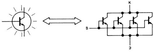 Рис. 3.65. Транзистор с большой площадью переходов можно рассматривать как много параллельно включенных транзисторов с малой площадью переходов.