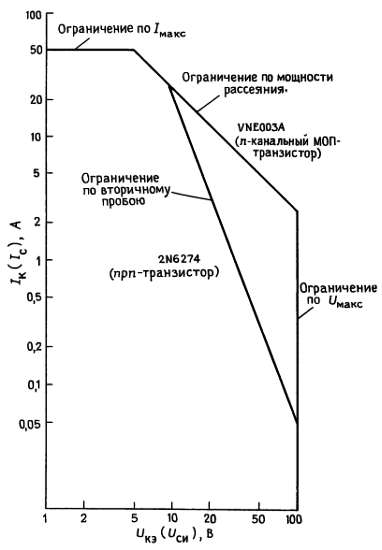 Сравнение сильноточных ключей на МОП-транзисторах и биполярных транзисторах. Мощные МОП-транзисторы в большинстве случаев являются хорошей заменой мощным биполярным транзисторам. Сегодня они при тех же параметрах стоят несколько больше, однако они проще в управлении и не подвержены вторичному пробою, ограничивающему область безопасной работы (см. рис. 3.66).