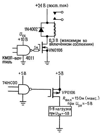 В первой схеме сигнал возбуждения затвора +10 В полностью откроет любой МОП-транзистор, так что мы выберем VN0106 — недорогой транзистор, у которого Rвкл < 5 Ом при UЗИ = 5 В. Диод в схеме защищает от индуктивных всплесков (разд. 1.31); включенный последовательно с затвором резистор хотя не обязательно необходим, однако полезен, так как емкость сток-затвор МОП-транзистора может передать индуктивный переходный процесс в нагрузке обратно на чувствительную КМОП-логику (вскоре мы расскажем об этом более подробно). Во второй схеме на затвор подается 5 В, что все еще неплохо для серий VN01/VP01; для разнообразия мы применили здесь p-канальный МОП-транзистор, переключающий нагрузку, подключенную к земле.