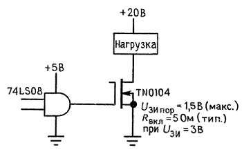 Две оставшиеся схемы демонстрируют два способа обработки сигнала +2,4 В (в худшем случае; обычно это где-то около +3,5 В) — высокого логического уровня цифровой логики ТТЛ. Можно использовать «подтягивающий» к +5 В резистор, чтобы обеспечить полный перепад +5 В на выходе ТТЛ, который затем возбуждает обычный МОП-транзистор; можно выбрать и другой путь — использовать что-нибудь вроде ΤΝ0106-«низкопорогового» МОП-транзистора, рассчитанного на сигнал возбуждения с уровнем ТТЛ. Будьте, однако, внимательны к паспортным данным. Например, в спецификации на TN01 указано «UЗИ пор = 1,5 В (макс.)», что звучит прекрасно до тех пор, пока вы не прочтете превосходную сноску («при IС = 1 мА»). Это означает, что для полного открытия МОП-транзистора на затвор нужно подать напряжение намного выше UЗИ пор (Рис. 3.68). Однако эта схема, возможно, будет работать хорошо, поскольку а) высокий уровень выхода ТТЛ редко бывает ниже +3 В и типичное его значение составляет +3,5 В и б) в паспорте на ΤΝ01 далее указано: «Uвкл (тип.) = 5 Ом при UЗИ = 3 В».