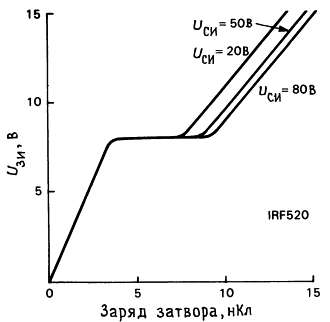 Рис. 3.69. Зависимость заряда затвора МОП-транзистора типа IRF520 от UЗИ.
