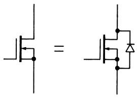 Рис. 3.71. В мощных МОП-транзисторах подложку соединяют с истоком, в результате чего образуется диодный переход сток-исток.