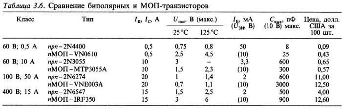 Помните, что МОП-транзистор во включенном состоянии ведет себя как малое сопротивление (а не как насыщенный биполярный транзистор). Это может оказаться выгодным, так как «напряжение насыщения» явным образом стремится к нулю при малых токах стока. Существует общее представление о том, что МОП-транзисторы не насыщаются так же при больших токах, однако наши исследования показали, что это представление глубоко ошибочно. В табл. 3.6 мы выбрали несколько сравнимых пар (биполярный p-n-транзистор и n-канальный МОП-транзистор) и выписали для них паспортные данные по UКЭ нас или RСИ вкл.