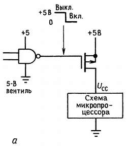 Некоторые примеры мощных переключательных схем на МОП-транзисторах. На рис. 3.72 показаны три разных способа использования МОП-транзистора для управления мощностью постоянного тока, которая направляется в некоторую подсхему и подачу которой нам хотелось бы включать и выключать. Если мы имеем измерительный прибор с батарейным питанием, и измерения с его помощью производятся от случая к случаю, тогда можно применить схему а, которая отключает потребляющий значительную мощность микропроцессор на все время, пока измерения не проводятся. Здесь мы применили p-канальный МОП-ключ, переключаемый 5-вольтовым логическим сигналом. Эта «5-вольтовая логика» представляет собой цифровые КМОП-схемы, которые находятся в рабочем состоянии даже тогда, когда микропроцессор отключен (напомним: КМОП-логика имеет статическую мощность рассеяния, равную нулю). В гл. 14 мы предлагаем гораздо подробнее рассказать о такого рода схеме «отключения питания».