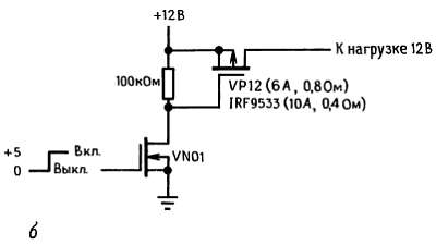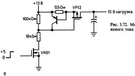 Вторая схема (рис. 3.72, б) переключает подачу в нагрузку питания +12 В при значительном токе нагрузки; это может быть радиопередатчик или что-то подобное. Поскольку у нас есть лишь 5-вольтовый диапазон логического сигнала, то для создания «полномасштабного» сигнала амплитудой 12 В, который будет управлять p-канальным МОП-вентилем, мы использовали слаботочный n-канальный ключ. Обратите внимание на высокое сопротивление резистора в цепи стока n-канального МОП-транзистора, что здесь совершенно оправдано, так как ток в цепи затвора p-канального МОП-вентиля не течет (даже при полном токе через ключ 10 А) и нам не требуется высокая скорость переключения в такого рода применениях.