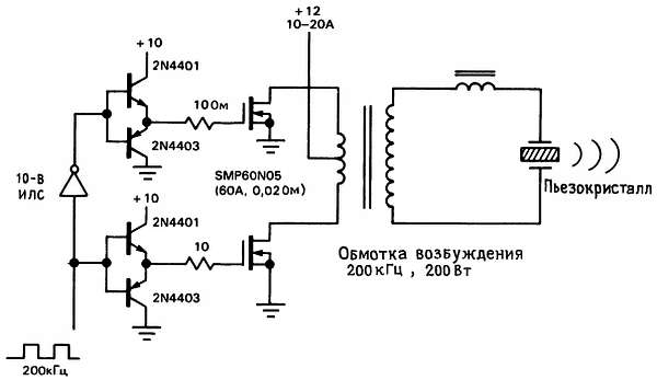 Рис. 3.74. Мощный возбудитель пьезокристалла на МОП-транзисторах.