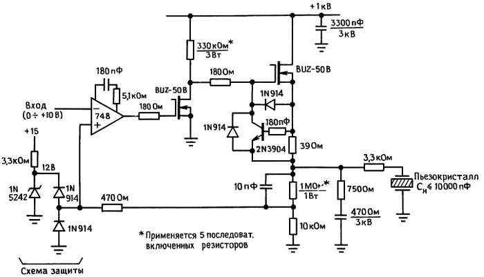 И наконец, на рис. 3.75 мы представили пример линейной схемы на мощных МОП-транзисторах. Керамические пьезоэлектрические преобразователи часто используются в оптических системах для осуществления небольших управляемых перемещений; например, в адаптивной оптике можно применить пьезоэлектрически управляемое «эластичное зеркало» для компенсации локальных изменений коэффициента преломления атмосферы.