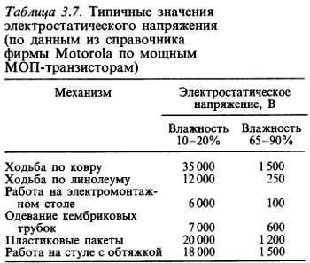 Как только устройство впаяно на свое место в схеме, шансы на его повреждение резко падают, тем более что многие МОП-транзисторные устройства (такие, например, как логические КМОП-устройства, но не мощные МОП-транзисторы) имеют предохранительные диоды во входных цепях затворов. Хотя цепи внутренней защиты, состоящие из резисторов и обратно включенных (иногда зенеровских) диодов, несколько ухудшают параметры, часто их все же надо применять для уменьшения риска повреждения статическим электричеством. В случае незащищенных устройств, например мощных МОП-транзисторов, устройства с малой площадью затвора (слаботочные) подвергаются наибольшей опасности повреждения, поскольку их малая входная емкость легко заряжается до высокого напряжения, когда она входит в контакт с заряженной емкостью человека 100 пФ. Наш собственный опыт работы с МОП-транзистором VN13, имеющим малую площадь затвора, был настолько удручающим, что мы больше не используем его в промышленных разработках.