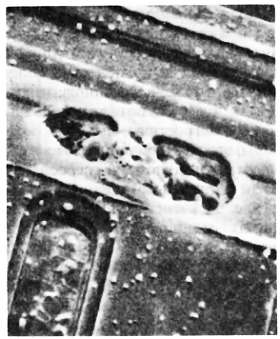Рис. 3.76. Сканирующая электронная микрофотография высокого разрешения (х1200) 6-амперного МОП-транзистора, разрушенного зарядом в 1 кВ, от «эквивалента человеческого тела» (1,5 кОм, включенного последовательно с емкостью 100 пФ), приложенного к его затвору.