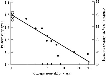Рис. 14. Соотношение между индексом яичной скорлупы [весом скорлупы (мг), деленным на произведение ее длины и ширины (мм2)] и логарифмом содержания ДДЭ (продукт разложения ДДТ) (мг на 1 кг сырого веса содержимого яйца) у сокола сапсана (Falco peregrinus) в Австралии. Толщина скорлупы яйца выражена также в процентах от «нормальной» толщины (принятой до 1947 г. в качестве средней величины).