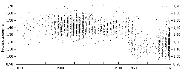 Рис. 15. Изменение индекса толщины яичной скорлупы у ястреба (Accipiter nisus) в период с 1870 по 1975 годы. Каждая точка соответствует средней величине для полной кладки. Величины взяты из всех крупных районов острова Великобритания. Излом кривой около 1947 года совпадает с годом первого широкого применения ДДТ в сельском хозяйстве Англии (Newton, 1981).