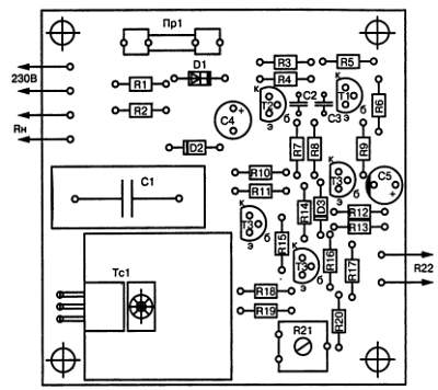 Установку элементов на печатной плате следует проводить в обычном порядке, то есть сначала необходимо впаять пассивные малогабаритные детали, затем полупроводниковые элементы, а после этого — крупногабаритные детали. При этом резистор R17 временно не устанавливается, а вместо резистора R20 следует установить перемычку. Особое внимание необходимо обращать на правильное расположение выводов транзисторов, симистора и электролитических конденсаторов.