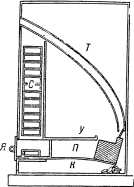 Устройство спичечного автомата Ивритта. Т — трубка, проводящая монеты; С — коробки спичек; Я — ящик; П — пружина, к концу которой прикреплен груз; К— касса; У — упор.
