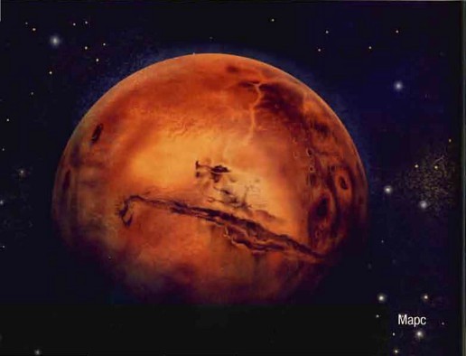 Марс — четвертая от Солнца планета. В среднем она удалена от Солнца на 227,4 млн. км (1,52 а, е). и облетает его за 686,9 земных суток. Орбита Марса сильно вытянута, поэтому его расстояние от Земли изменяется в широких пределах. Ближе всего Марс подходит к нашей планете во времена так называемых великих противостояний, которые повторяются каждые 15–17 лет. В это время расстояние между Землей и Марсом сокращается до 56 млн. км. Во время таких сближений двух планет Марс сияет на ночном небе интенсивнее самых ярких звезд. У этой «звезды» оранжево-красный цвет, и потому древние греки связали ее в своем воображении с богом войны Аресом (которому в римской мифологии соответствовал Марс).
