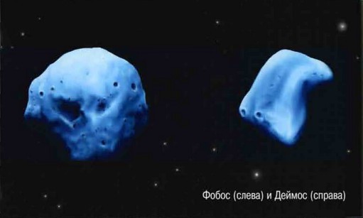 Разумеется, ничего ужасного в спутниках Марса нет. Размеры Фобоса — 28×20×18 км, его орбита отстоит от центра планеты на 9350 км. Один оборот вокруг Марса Фобос совершает за треть марсианских суток, которые длятся 24 ч 37 мин. Размеры Деймоса — 16×12×10 км. Он удален от Марса на 23,5 тыс. км и обращается вокруг него за 30 ч 17 мин. Оба спутника лишены атмосферы и всегда обращены к Марсу одной и той же стороной. Поверхность Деймоса и Фобоса покрыта кратерами, самый крупный из которых — Стикни на Фобосе — достигает в диаметре 10 км.