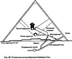 Расположенная на плато Гиза близ современного Ка ира Великая пирамида является единственным сохранившимся памятником из семи чудес античного мира. Это колоссальное сооружение сложено приблизительно из 230 тысяч каменных блоков, каждый из которых в среднем весит около 2,5 тонны и занимает площадь более тринадцати акров. Оно вдохновляло людей на протяжении многих столетий. О нем было написано больше книг, чем о любом другом древнем памятнике, и оно все еще хранит множество тайн. Оно является практически уникальным среди пирамид Египта, а их насчитывается более восьмидесяти. Почти все они являются целиковыми сооружениями, возведенными над погребальными покоями, устроенными на уровне земли или под землей, а в Великой пирамиде Хуфу главные внутренние покои находятся в теле самой пирамиды (рис. 20).