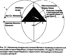 Я торопливо воспроизвел поперечное сечение пирамиды в том же масштабе, что и треугольник на моей карте, и с удивлением обнаружил, что местоположение камеры Царя точно совпало с леи Св. Михаила в месте, известном под названием «Фермы Храма». Не менее примечательно и то, что линия восходящего коридора и Большой галереи проходит между центром восточного круга и точкой, где леи Св. Михаила пересекает линию, соединяющую две точки, в которых пересекаются два круга на местности (рис. 21). Шансы случайного совпадения должны быть просто астрономическими.