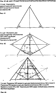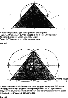 В рисунке Марлборо-Даунс ключом служил равносторонний треугольник. Взяв его за основу, свойственную пирамиде Хуфу, геометрию можно показать с помощью рисунков 41–46. Такой поэтапный чертеж фиксирует местоположение всех камер и ходов Великой пирамиды.