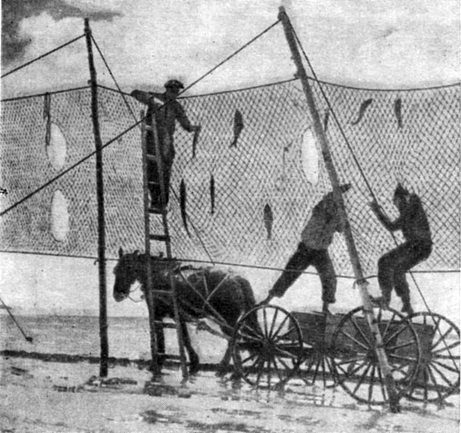 Словно фрукты с дерева снимают рыбаки в отлив застрявшую в сетях рыбу. Не в лодке, а на телеге собирают улов в Горле Белого моря, в заливе Фанди в Северной Америке, у берегов Англии и Нормандии