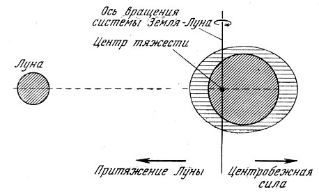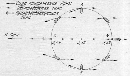 Сложение силы притяжения Луны с центробежной силой, возникающей при вращении системы Земля - Луна, создает приливообразующую силу. Приливообразующая сила в точках A и B увеличивает силу тяжести, но не образует ни прилива, ни отлива. В точках Z и N она уменьшает силу тяжести, но также не образует прилива. Приливообразующие силы в секторах между точками A, Z, B и N увлекают воду к точкам Z и N, благодаря чему в океане возникают две приливные волны