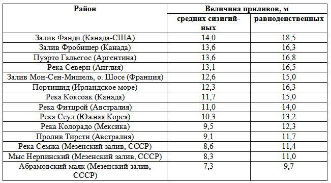 В приведенной таблице 1 перечислены некоторые пункты, в которых приливы особенно велики.