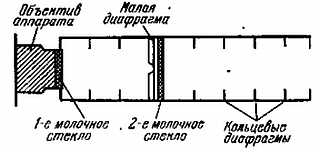 В трубке укрепляются два просвечивающих экрана из молочных стекол: один непосредственно перед объективом аппарата, другой — в 10 см от него, вплотную к первому (считая от открытого конца трубки) экрану ставится малая диафрагма, размер которой мы подберем из опыта.
