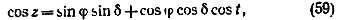 где ω — широта места, δ — склонение Солнца, t — его часовой угол; значение t в градусах равно