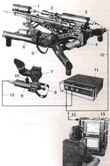 1 — видеокамера обзора; 2 — оптический прицел оружия; 3 — видеокамера наведения; 4 — амортизатор отдачи оружия; 5 — лямка для переноски; 6 — станок из углепластика. Блок управления; 7 — видоискатель; 8 — рукоятка наведения оружия; 9 — тумблер управления спусковым механизмом оружия; 10 — тумблер управления предохранительным механизмом оружия; 11 — блок питания и контроля работы аппаратуры; 12 — соединительные кабели; 13 — монитор командного пункта.