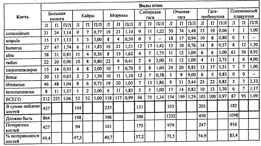 Выполнение аналогичных вычислений для других видов промысловых птиц добывавшихся эскимосами, показало (табл. 1), что еще до захоронения в культурном слое теряется от 41 % до 84 % костей. Такие большие потери костей не должны удивлять. У древних эскимосов кости добычи не только попадали в культурный слой вместе с кухонными отходами, но и использовались для изготовления оружия и бытовых предметов, шли на сооружение каркасов землянок и мясных ям, сжигались как топливо, растаскивались собаками.
