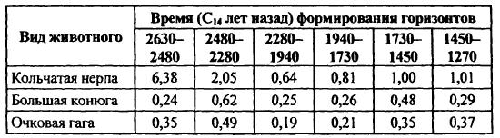 Таблица 2. Скорость накопления костей наиболее многочисленных животных в горизонтах культурного слоя Дежневского древнеэскимосского поселения (шт. в год на 6 м2).