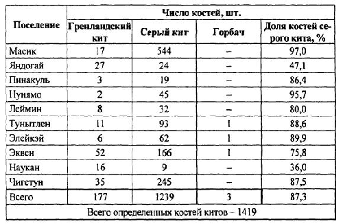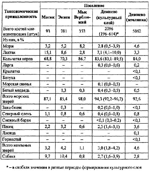 Из древнеэскимосских поселений Чукотки нами было определено около 10 тысяч костей китообразных и более мелких млекопитающих. Результаты определения очень близки (табл. 3). Их сопоставление показало, что по всему чукотскому побережью Берингова моря эскимосы добывали главным образом морских зверей, среди которых первые места занимали кольчатая нерпа, лахтак и морж. На обитателей тундры — песца, зайца-беляка, северного оленя и снежного барана приходилось лишь менее 5 % костей.