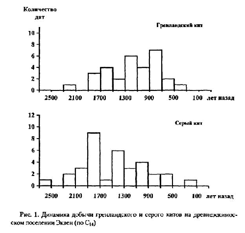 При обследовании руин 10 древнеэскимосских поселений, расположенных в разных районах Чукотского побережья (табл. 4) было найдено 1419 костей китов. Из них 1239 костей (87,3 %) принадлежали серым китам, 177 — гренландским китам и только 3 кости — горбатым китам (горбачам). Как показывают собранные материалы, древние эскимосы добывали преимущественно серых и отчасти гренландских китов. Для временной привязки материала нами были продатированы по радиоуглероду 30 костей гренландского и 34 кости серого китов из древнеэскимосского поселения Эквен. Распределение полученных датировок (рис. 1) дает представление о вековой динамике китобойного промысла чукотских эскимосов. Оно подтверждает, что на всем протяжении существования Эквенского поселения его жители промышляли главным образом серых китов. Гренландские киты в их жизни играли заметно меньшую роль. Наиболее ранняя дата захоронения на Эквене серого кита — 2505±129 лет назад (ИЭМЭЖ-845). Позднее число захоронений костей этого вида непрерывно увеличивалось и достигло максимума 1900–1700 лет назад. В период 1700–1500 лет назад количество их захоронений сильно уменьшилось. Позднее, 1500–1300 лет назад оно снова возросло, а затем постепенно снижалось. Следует отметить, что 90 % всех костей серого кита из древнеэскимосских поселений Чукотки принадлежало сеголеткам. Наибольшее количество остатков гренландского кита относится ко времени 1300–1100 и 900–700 лет назад.