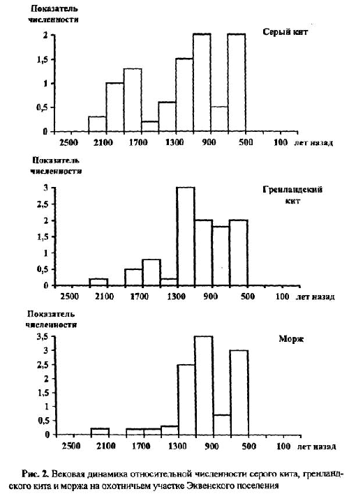 На основании данных по динамике добычи и динамике относительной численности населения древнеэскимосских поселений нами выявлена динамика численности различных видов промысловой фауны охотничьего участка поселения (рис. 2). У серого кита за последние тысячелетия наблюдалось три периода подъема численности — 1900–1700, 1300-900 и 700–500 лет назад и три периода относительно низкой численности — 2300–2100, 1700–1300 и 900–700 лет назад. Динамика численности гренландского кита и моржа довольно схожа. Оба вида характеризовались довольно низкой численностью в период до 1300 лет назад, после чего она заметно выросла. Отличием является то, что у моржа отмечается еще одно снижение численности в период 900–700 лет назад.