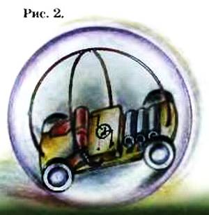 Шар-игрушка к опрокидыванию более устойчива. Правда, при столкновении с преградой находящийся в нем автомобильчик — назовем его движителем — может перевернуться колесами вверх. Но этому можно воспрепятствовать, установив на шаре две взаимно перпендикулярных дуги безопасности. Тогда система рано или поздно придет в нормальное положение (рис. 2).